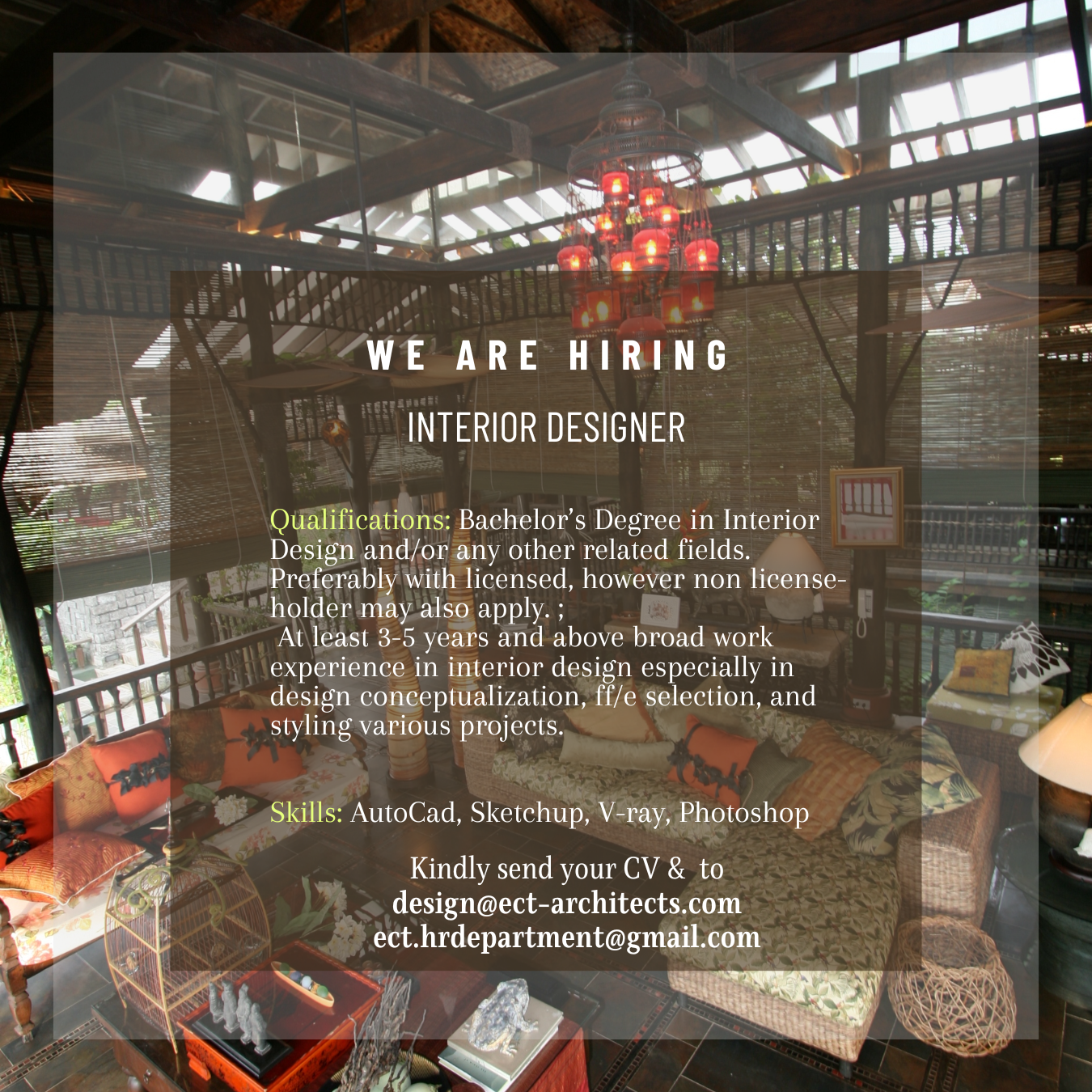 - Must be well-versed in various softwares utilized in interior design especially with autocad, sketch-up, vray, and photoshop. Any additional softwares expertise is a plus.